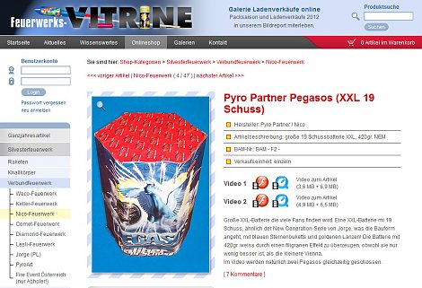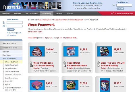Die Feuerwerksvitrine ist ein Onlineshop bei dem über das ganze Jahr hinweg Silvesterfeuerwerk bestellt werden kann. Die gesetzlichen Vorgaben in Deutschland erlauben die Abgabe von Feuerwerkskörpern nur an den letzten drei Verkaufstagen im Jahr. Ausgenommen sind jedoch besondere Anlässe, wie Hochzeiten und runde Geburtstage, für die gegen eine behördliche Genehmigung, auch innerhalb des Jahres Feuerwerk abgegeben werden kann. Der Shop ist also keineswegs nur auf das Jahresendgeschäft angewiesen.