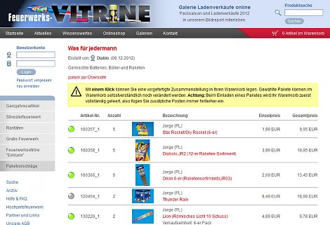 Viele Feuerwerksbegeisterte besuchen täglich die Seite, um sich über Neuheiten zu informieren, aber auch, um in dem umfangreichen Raritätenangeboten des Shops zu stöbern. Unzählige Feuerwerksvideos, Kundenkommentare, öffentliche Einkaufslisten und mehr haben den Shop zu einer beliebten Feuerwerks-Community wachsen lassen. Der Feuerwerksshop wird von meinem Bruder und mir als kleines Familienunternehmen betrieben und nimmt so einen besonderen Platz im Portfolio von Nowottnick-Design ein.