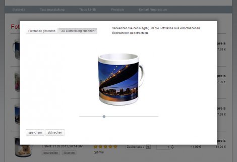 Die innovative 3D-Darstellung der erstellten Fototasse ist das besondere Highlight der Seite. Zusammen mit den Entwicklern von photo-druck.de wurde ein kleines Shopsystem und ein Produkteditor entwickelt.